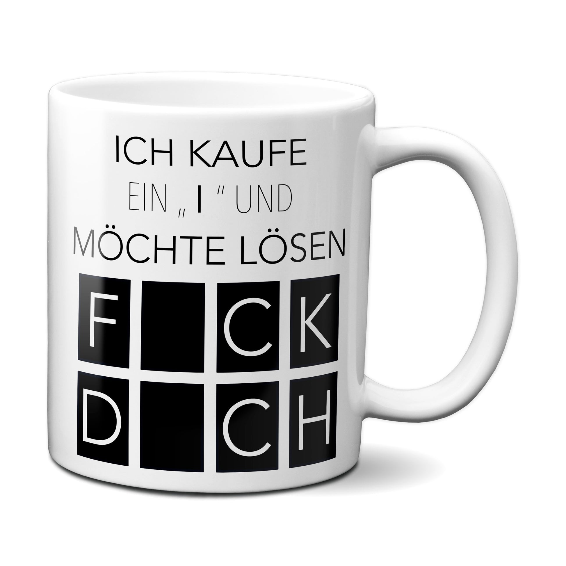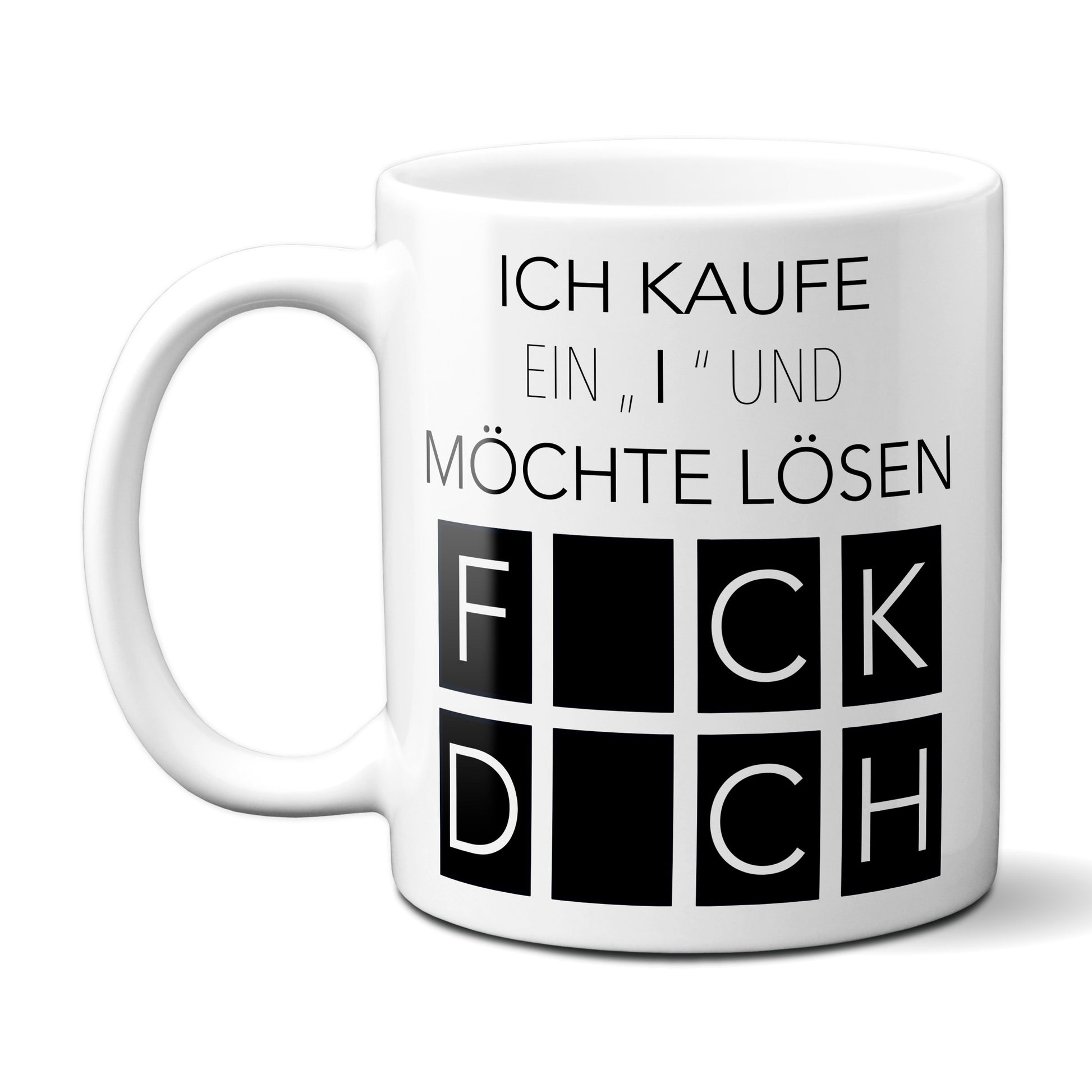 Die Tasse besteht aus hochwertiger Keramik und hat ein Fassungsvermögen von 320 ml, sodass du genug Platz für deinen Lieblingskaffee hast. Der witzige Spruch "Ich kaufe ein I und möchte lösen - Fick Dich" ist in kräftigen Farben und in einer modernen Schrift auf der Tasse gedruckt, was sie zu einem echten Blickfang macht.