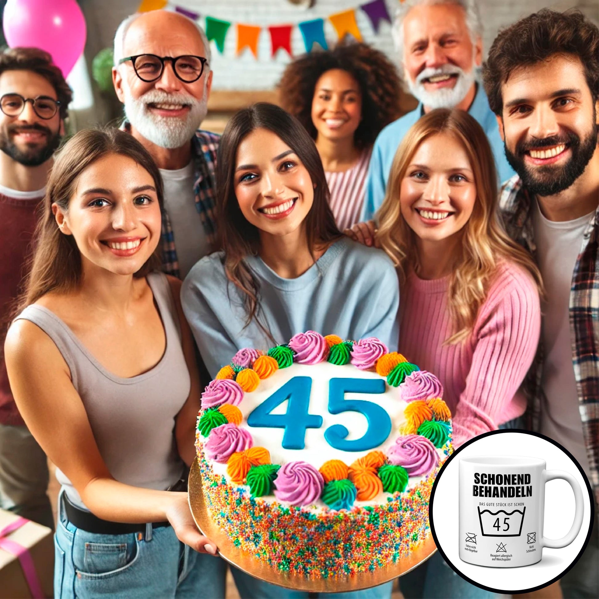 - Auffälliges Design: Kaffeetasse mit Spruch "Schonend behandeln. Das gute Stück ist schon 45." sorgt für Aufsehen und bringt dich zum Schmunzeln – egal ob im Büro oder zu Hause.