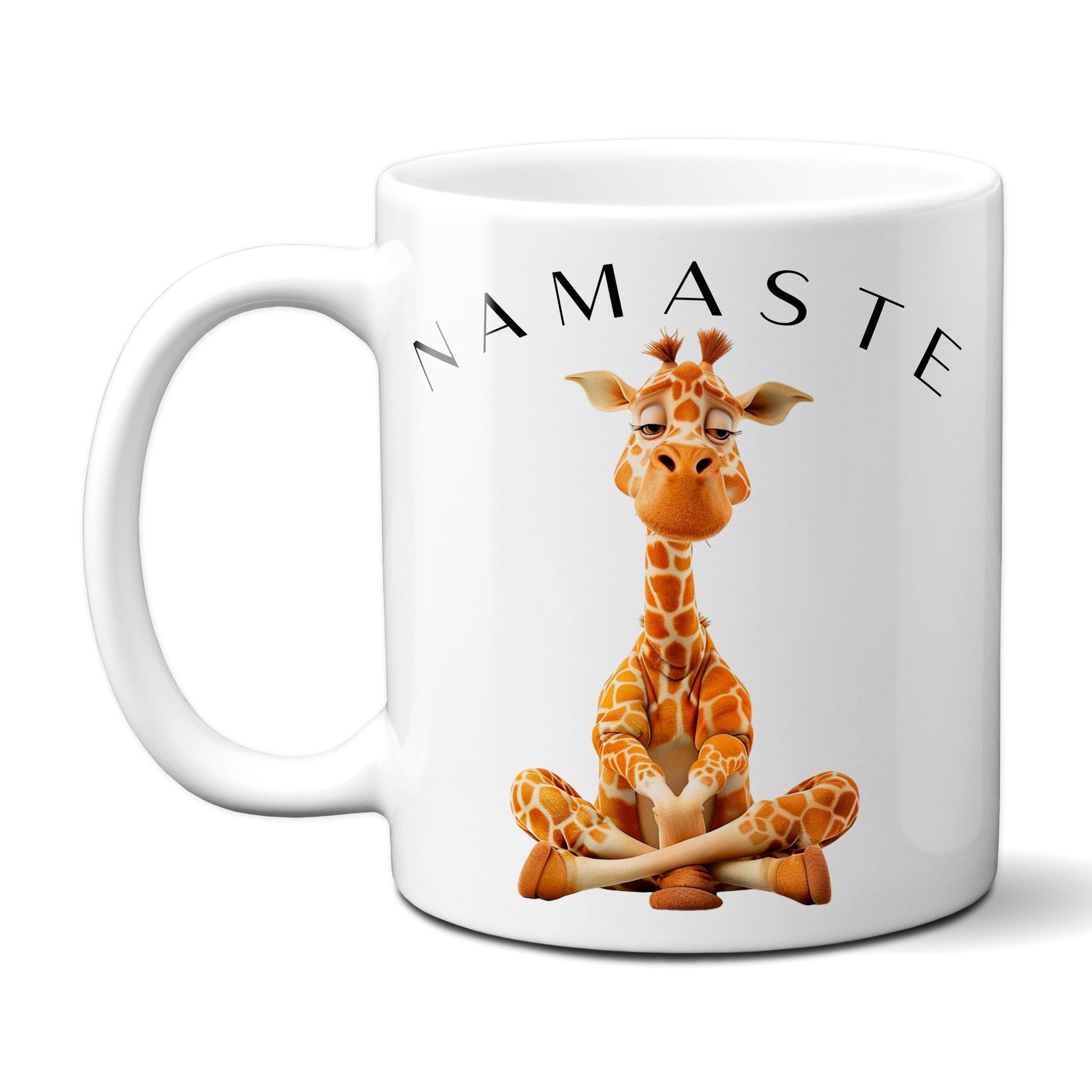 Unsere Kaffeetasse mit dem bezaubernden Design einer entspannten Giraffe und dem inspirierenden Schriftzug "Namaste" ist der perfekte Begleiter für Ihre Morgenroutine oder gemütliche Tee-Pausen.